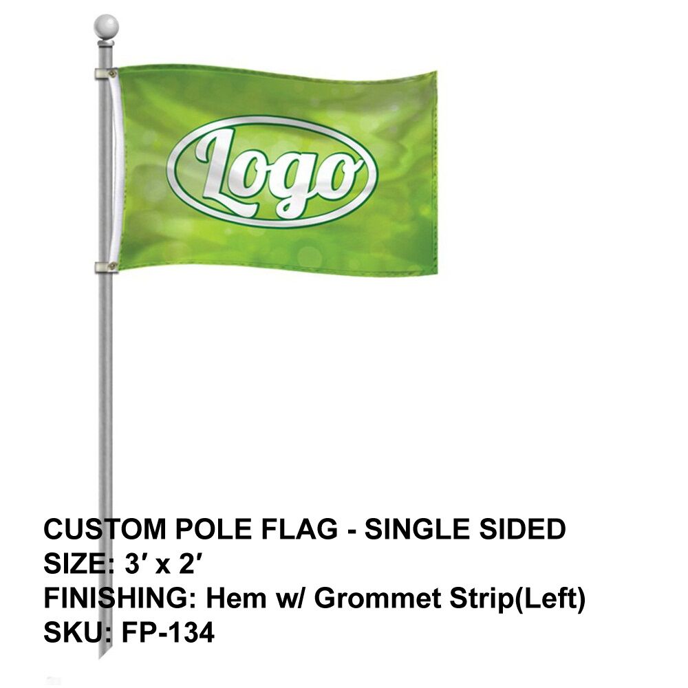 Our custom pole flags can transform your logo or artwork into a dynamic flying reality. Flags are printed with high quality eco-safe inks through our dye sublimation process. Whether you are flying your flag on a pole or simply hanging it in your room, we offer two types of finishing to accommodate your displaying needs. Please see below for details.
