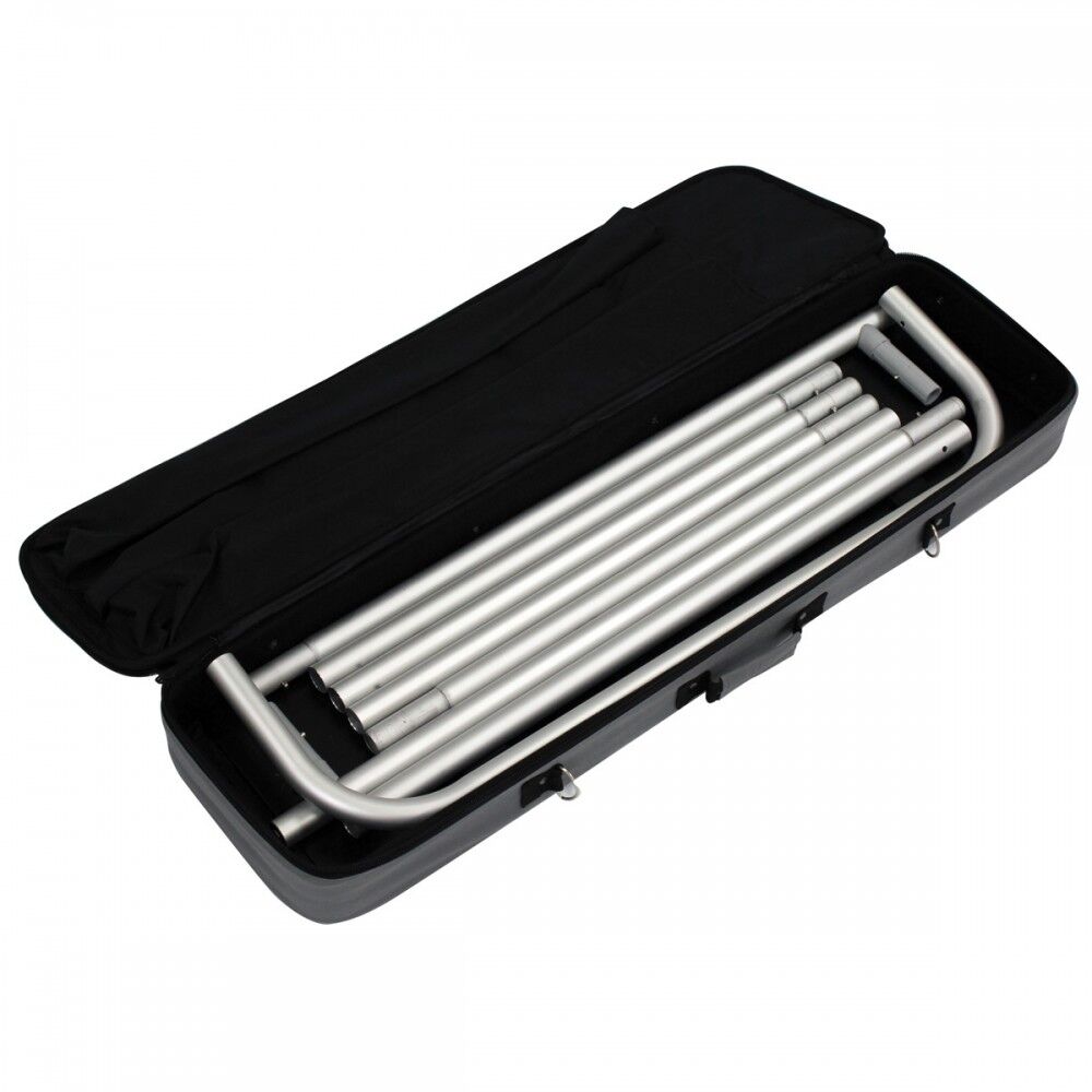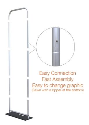 Expedite your banner stand setup time while adding lavish appeal with our newest EZ Tube fabric display the EZ Extend! Hardware comes stock at 7.5ft tall with height options of 5.5ft, 8.5ft, and 9.5ft. Customize a single-sided (choose white or black back fabric) or double-sided dye- sublimated stretch fabric print. To assemble, secure the longest vertical poles onto the black steel base using the included allen wrench. Add the bottom horizontal support pole and secure. Snap on the remaining vertical poles, then top frame with the curved bar to complete. Tilt or lay down EZ Extend to swiftly drape with the pillowcase graphic. Using the industrial-size zipper, zip underneath the support pole, maximizing fabric tension.