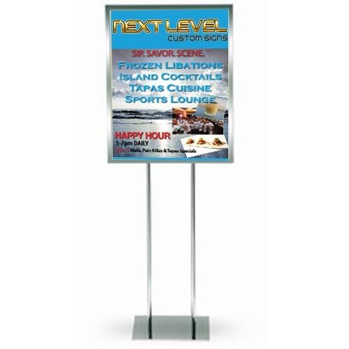 This display stand features a 1/4″ top loading slot that accepts foam core boards and signs. Graphics must be mounted to 1/4″ board. IS-1 stands 60″ high from the ground.