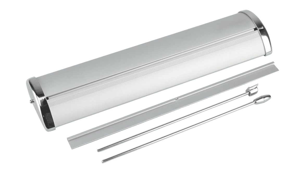 Our new Mini Retractable Banner Stand or Table Top Banner Stand is a fantastic option for those that are looking to add a Wow! factor to POP signage. It’s a miniature version of our popular Deluxe Banner Stand and displays an A3 sized graphic that can be retracted for safe keeping or travel. The hardware has a silver body construction and chrome endcaps.